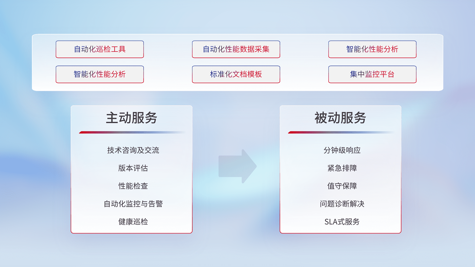 智能化工具和标准化文档,,,,保障服务质量,,,提供主动服务(包含技术咨询、、、版本评估、、、、性能检查、、、自动化监控与告警、、、、健康巡检)和被动服务包含(分钟级响应、、紧急排障、、、、值守保障、、问题诊断解决、、、、SLA服务)。。